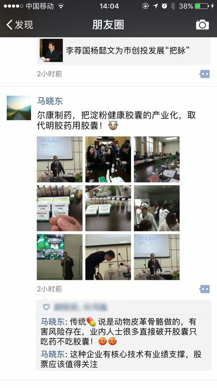 网络大V在朋友圈为尔康制药淀粉胶囊点赞
