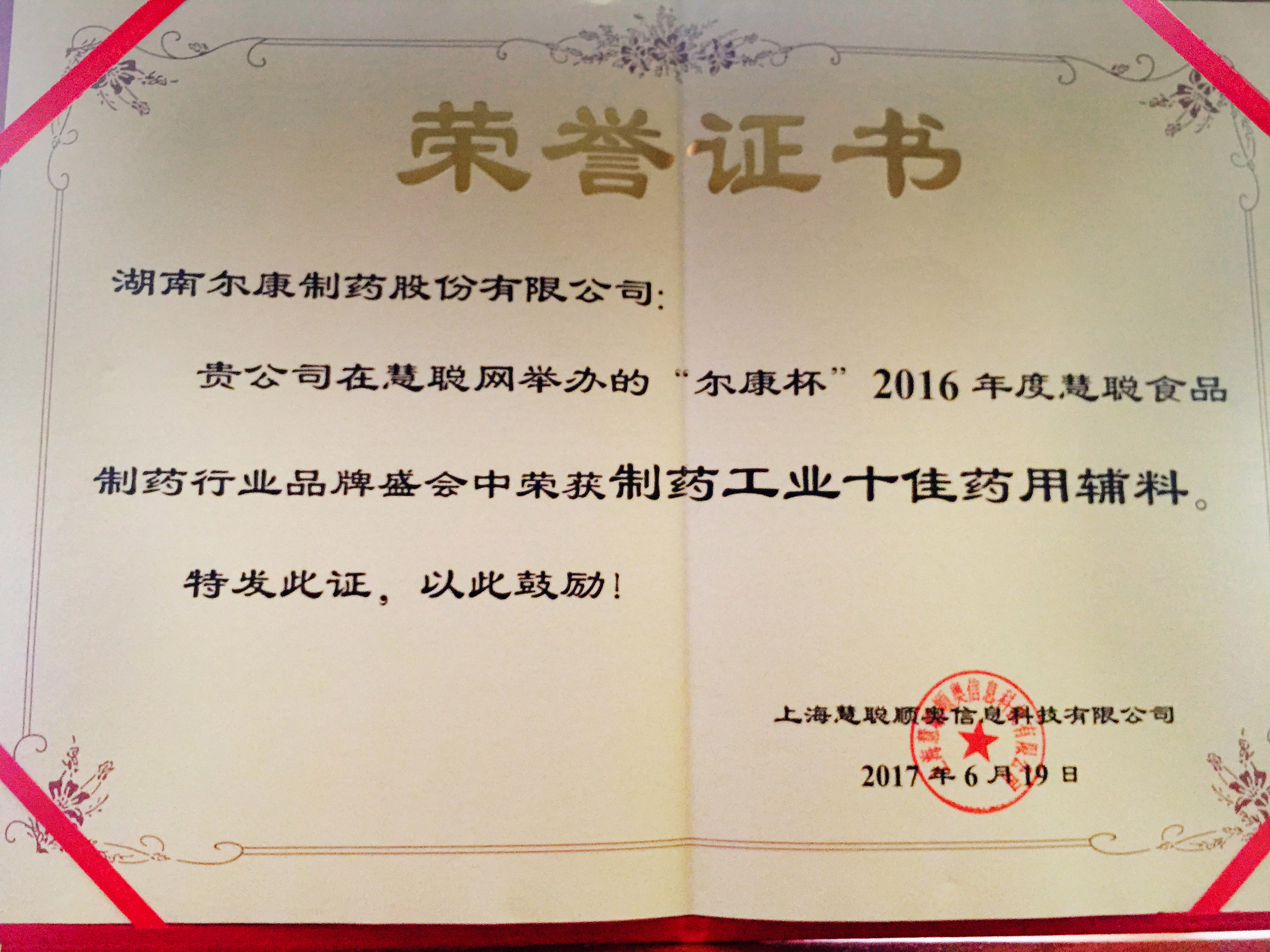 6月1920日,2016年度慧聪网食品制药行业品牌盛会在上海召开,尔康制药位列“制药工业十佳药用辅料品牌”奖项第一名,公司董事、副总经理王向峰代表公司接受奖项并向大会致辞。